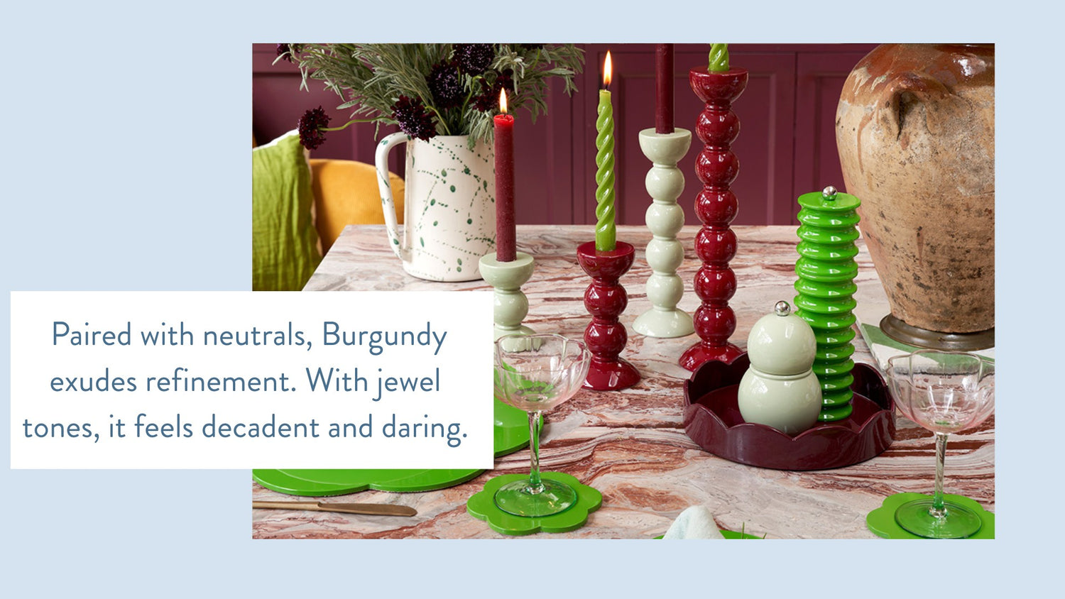 Burgundy tells your guests something about you, that you appreciate the finer things, that your style choices are deliberate, that you understand the subtle power of colour. It’s the shade that whispers, I’m chic, without ever needing to shout.