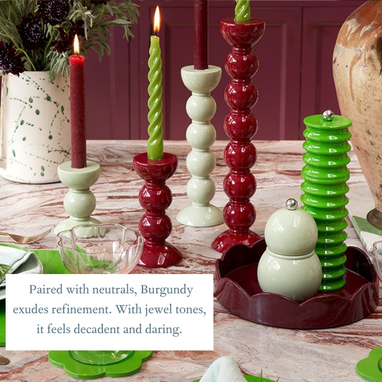 And perhaps that’s why we’re so smitten. Burgundy doesn’t just decorate a room, it creates a mood. It invites conversation, lingers in the memory, and adds an unmistakable note of elegance to everyday life. Whether it’s the warm glow of our Cherry Bobbin Lamp or a discreet pop on your coffee table, it’s a shade that will always feel like the final, perfect brushstroke.