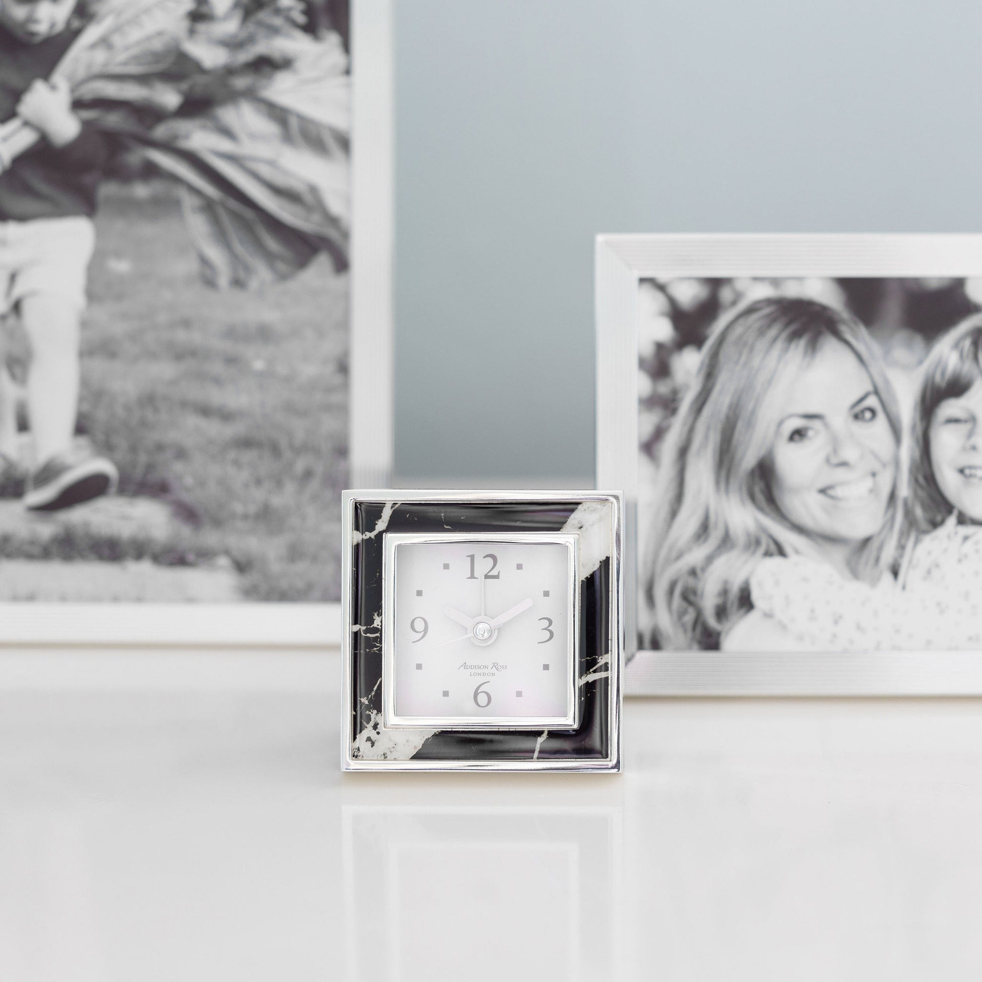Our black marble alarm clock beautifully compliments our Faux Marble & Silver frames, complete with an alarm function, this clock is ideal for a bedside table or desk. Backed in black velvet with a silver clock movement cover.
