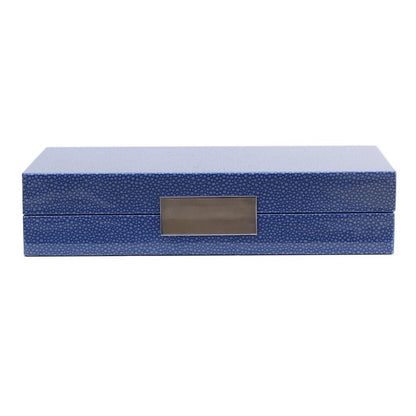 This beautiful lacquered Blue Shagreen Jewellery Box measures 4x9x2 inch and features a silver-plated clasp and matching hinges. All of our boxes have had 20 coats of lustrous polished lacquer.
