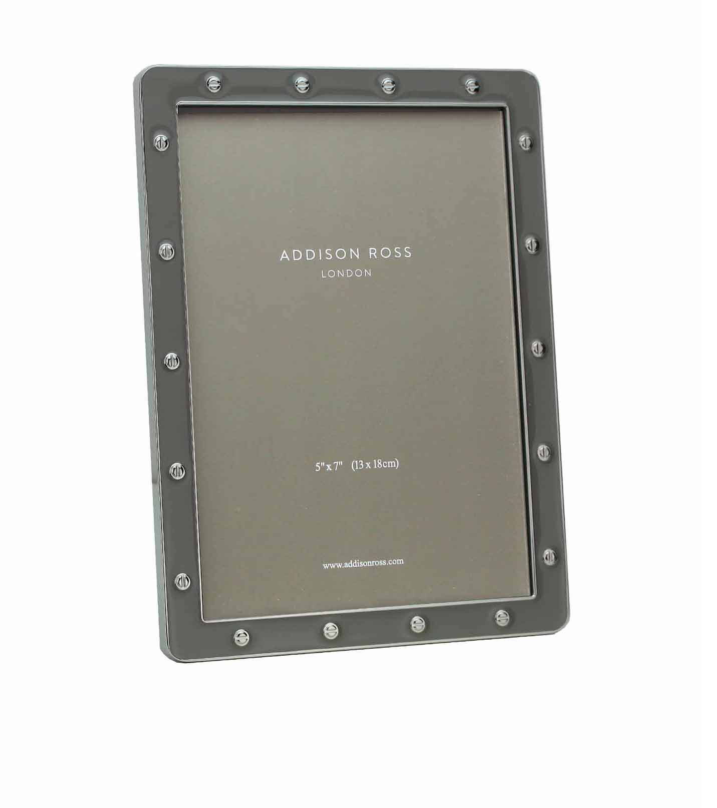 A beautiful chiffon enamel & silver plate frame with screw detail, curved corners and a beautiful dove grey velvet backstand.