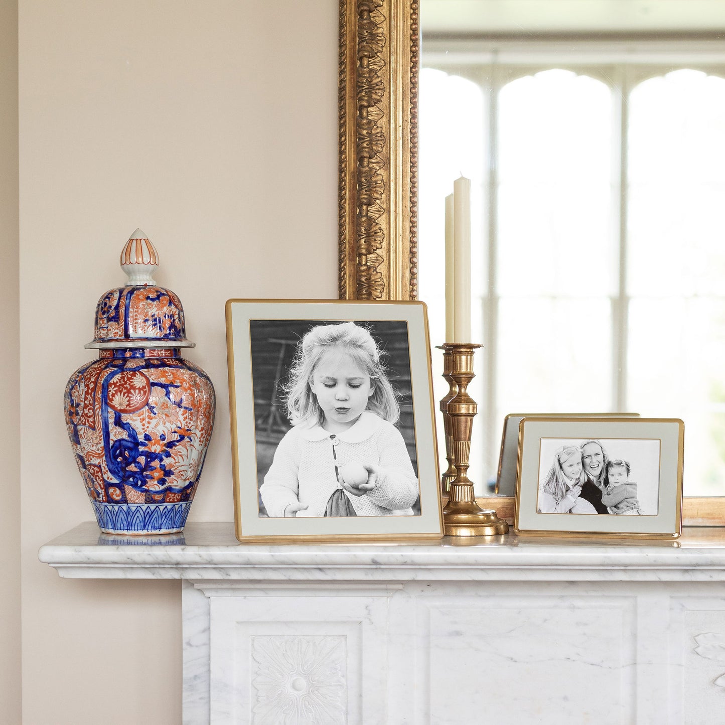 - 1 in. wide, chiffon gray enamel frame finished with gently curved gold trim