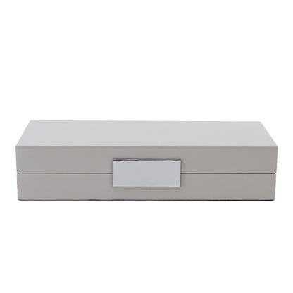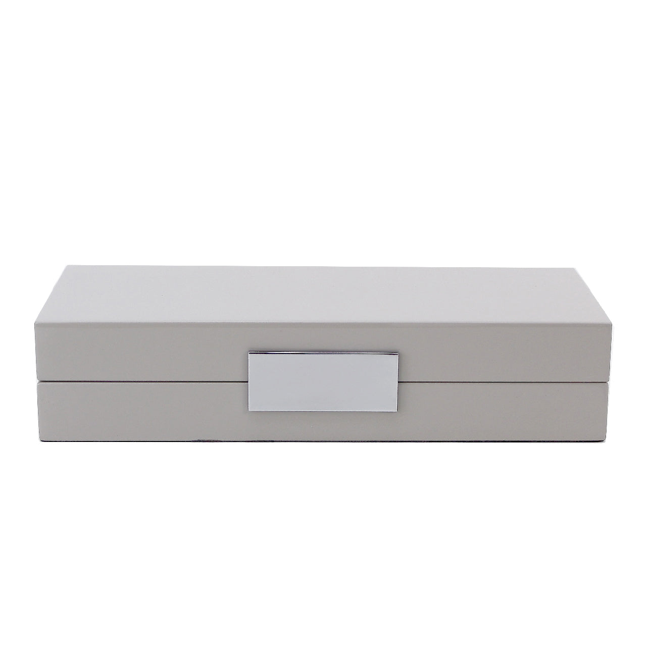 This beautiful lacquered Chiffon Grey Jewelry Box measures 4x9x2 inch and features a silver clasp and matching hinges. All of our boxes have had 20 coats of lustrous polished lacquer.