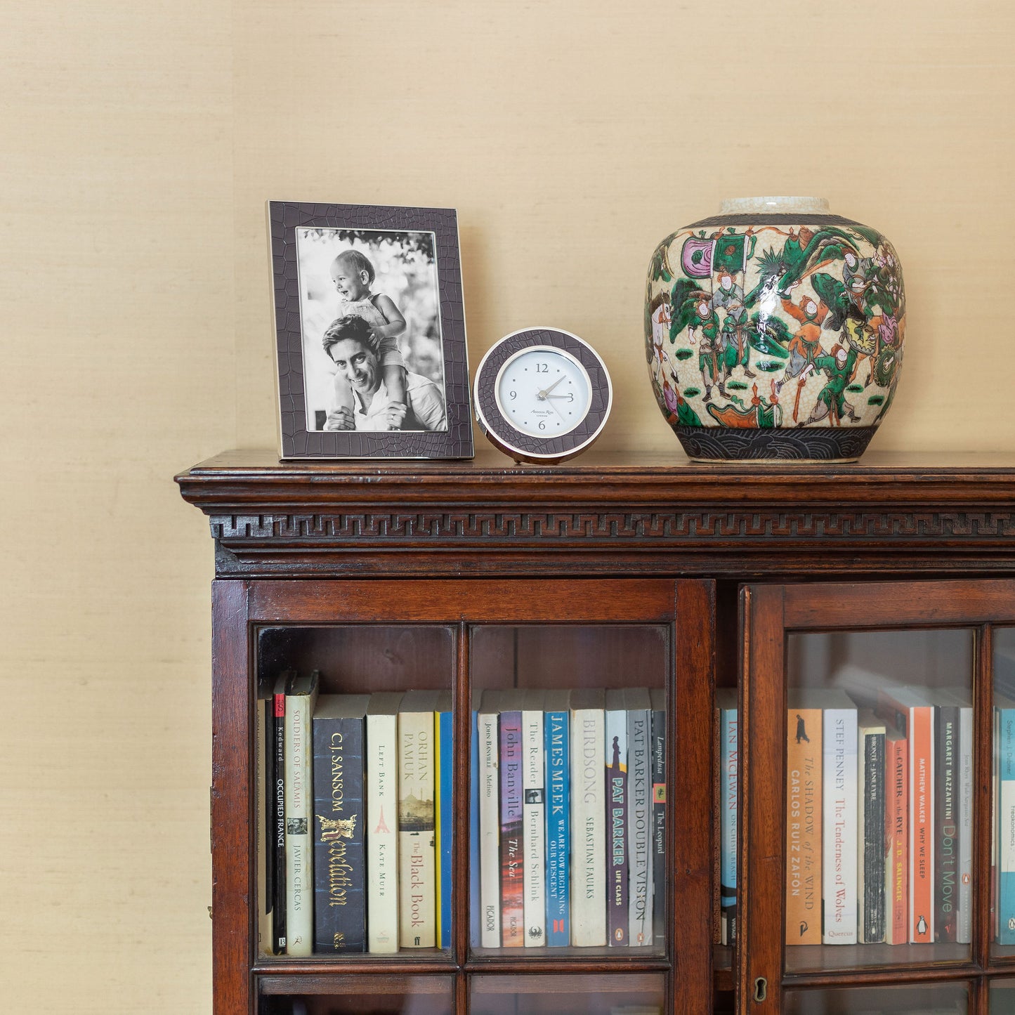 Our faux chocolate brown faux croc alarm clock beautifully compliments our enamel frames, complete with an alarm function, this clock is ideal for a bedside table or desk. Backed in grey velvet with a silver clock movement cover.