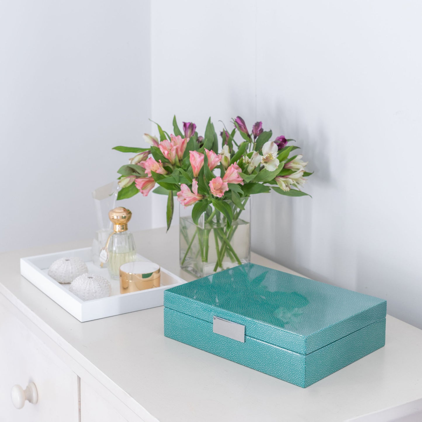 - Shagreen effect exterior finished with 20 coats of lustrous lacquer