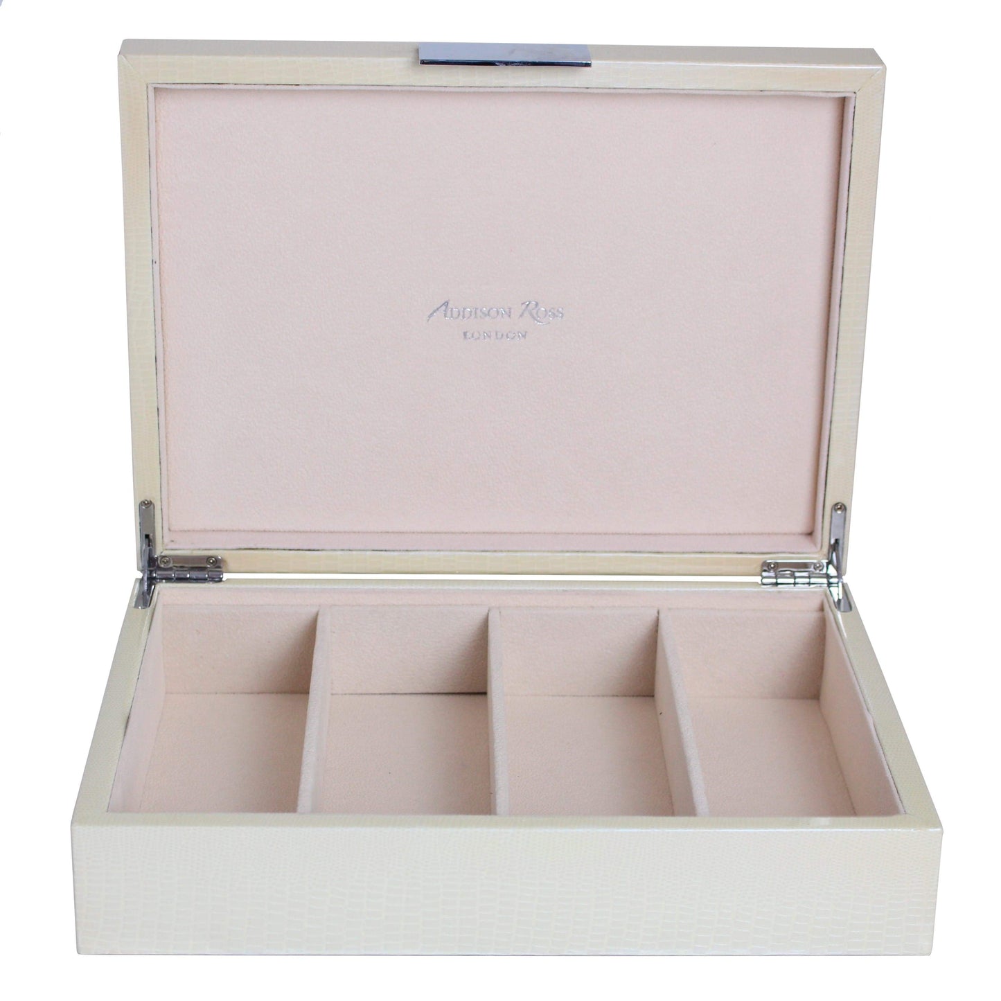 This stunning high gloss lacquered Box has a faux croc design in a shade of Vanilla cream, there is a hint of yellow in the colour and it is finished with a pearl sheen.