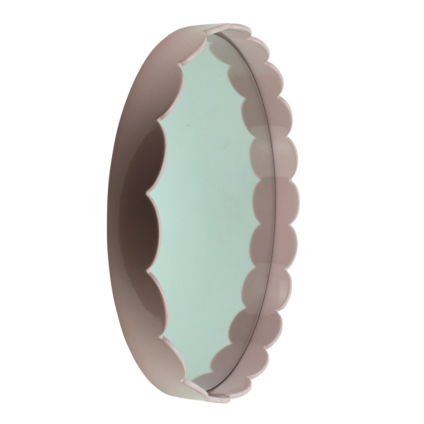 A beautifully finished pale pink scallop edged wall hanging mirror, featuring 20 coats of lacquer, hand polished between each coat. The mirror is recessed within the scallop edge to create a slightly 3 D reflection of the scallop within the frame.