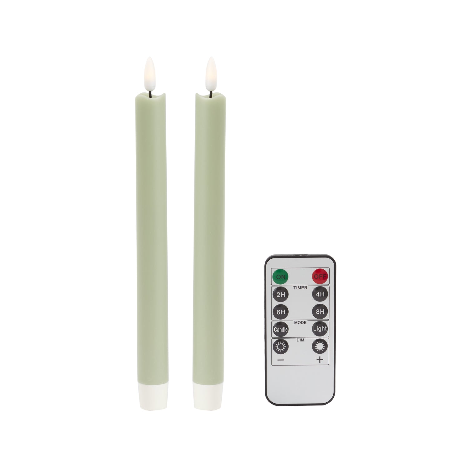 Our 23cm Sage LED battery powered wax Candles. Colour matched with our lacquered bobbin candlesticks and made with real wax. Supplied with batteries and a remote control, they come beautifully gift-boxed as a pair. Select the flicker mode for a subtle twinkle, eliminating concerns about wax spills or wind gusts.