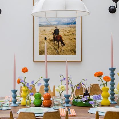 An Addison Ross exclusive design, our extra tall chambray blue lacquered bobbin shaped candlestick is made from sustainably sourced rubber wood, finished with 8 coats of high gloss lacquer hand polished between each coat. Suitable for standard sized dinner candles.