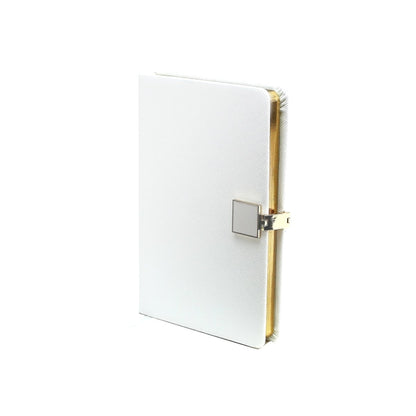Our A6 notebook in a stunning white coloured faux leather finish has 100 pages in 80 gsm cream coloured paper with lines and a gold edge. It is finished with a magnetic enamel clasp and embossed Addison Ross logo on the rear cover.